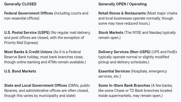 As a federal holiday, the second Monday in October triggers certain closures and operational changes across the United States,