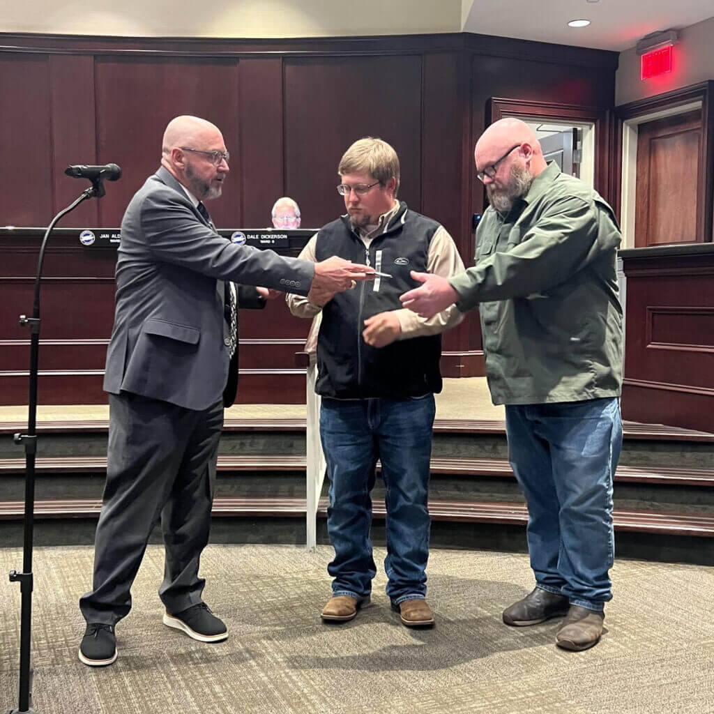 The meeting also served as a platform for local honors. Alderman Don Gammage and Police Chief Carlos Garcia were recognized for receiving Trailblazer Awards at a recent Dr. Martin Luther King Jr. Day program. Additionally, the Mayor’s Award was presented to Eddie Baldwin and Taylor Swallows of the Parks Department for their proactive work clearing debris on Highway 305.