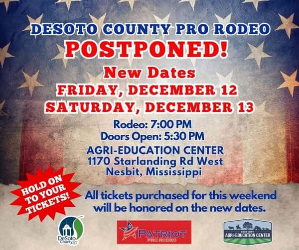 The rescheduled dates for the DeSoto County Pro Rodeo are Dec. 12 and 13. All tickets purchased for the originally scheduled weekend will be honored on the new dates. Patrons and competitors are asked to hold onto their existing tickets.
