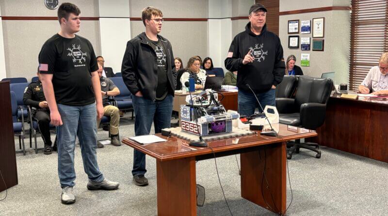 Photo: Joe Ricker (right) with Raymond Rule and Nathan Ricker demonstrate their robot to the DeSoto County Board of Supervisors Tuesday morning. (Bob Bakken/desotocountynews.com)
