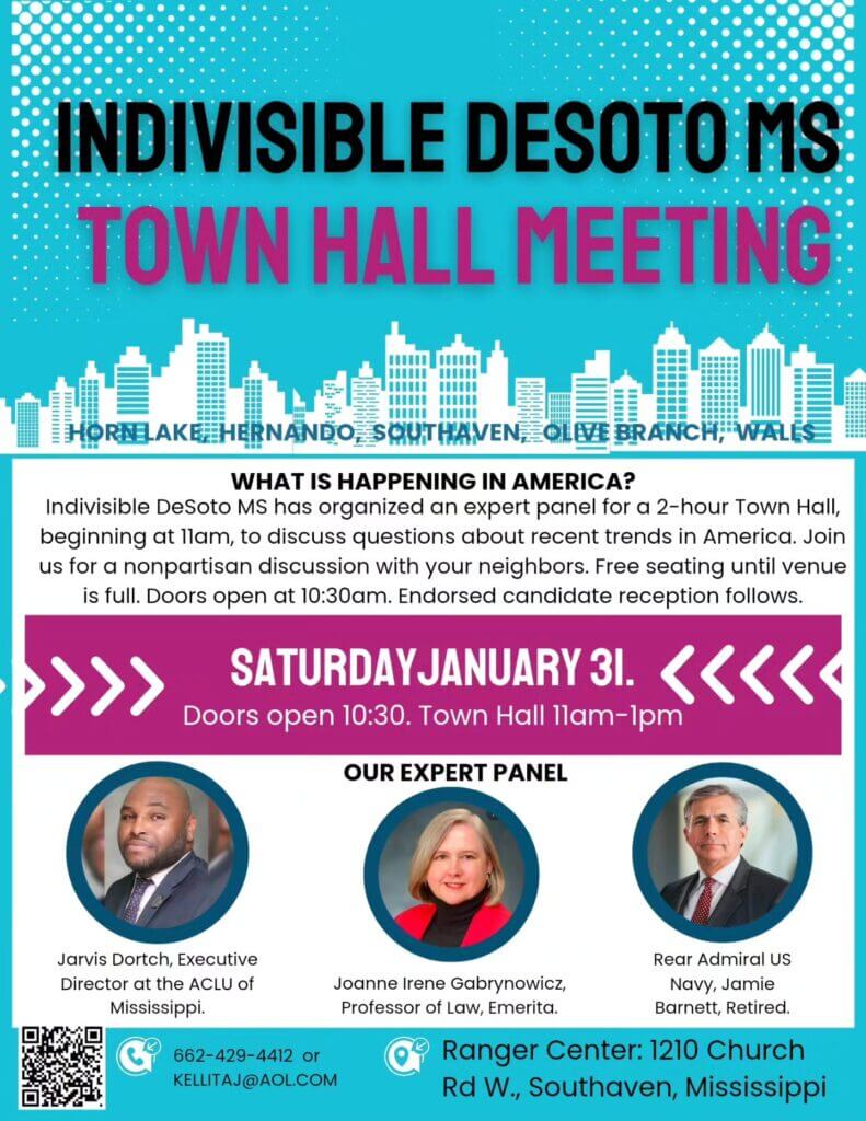 SOUTHAVEN, Miss. — Indivisible DeSoto MS will host a “What’s Happening in America” town hall on Saturday, Jan. 31, bringing together legal, civil rights, and national security experts for a public discussion on key issues facing the country. The event begins at 11 a.m. at Northwest Mississippi Community College’s Ranger Community Center, 1210 Church Road West in Southaven. Admission is free, and doors open at 10:30 a.m.
