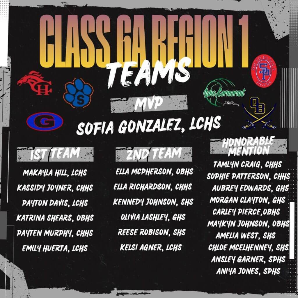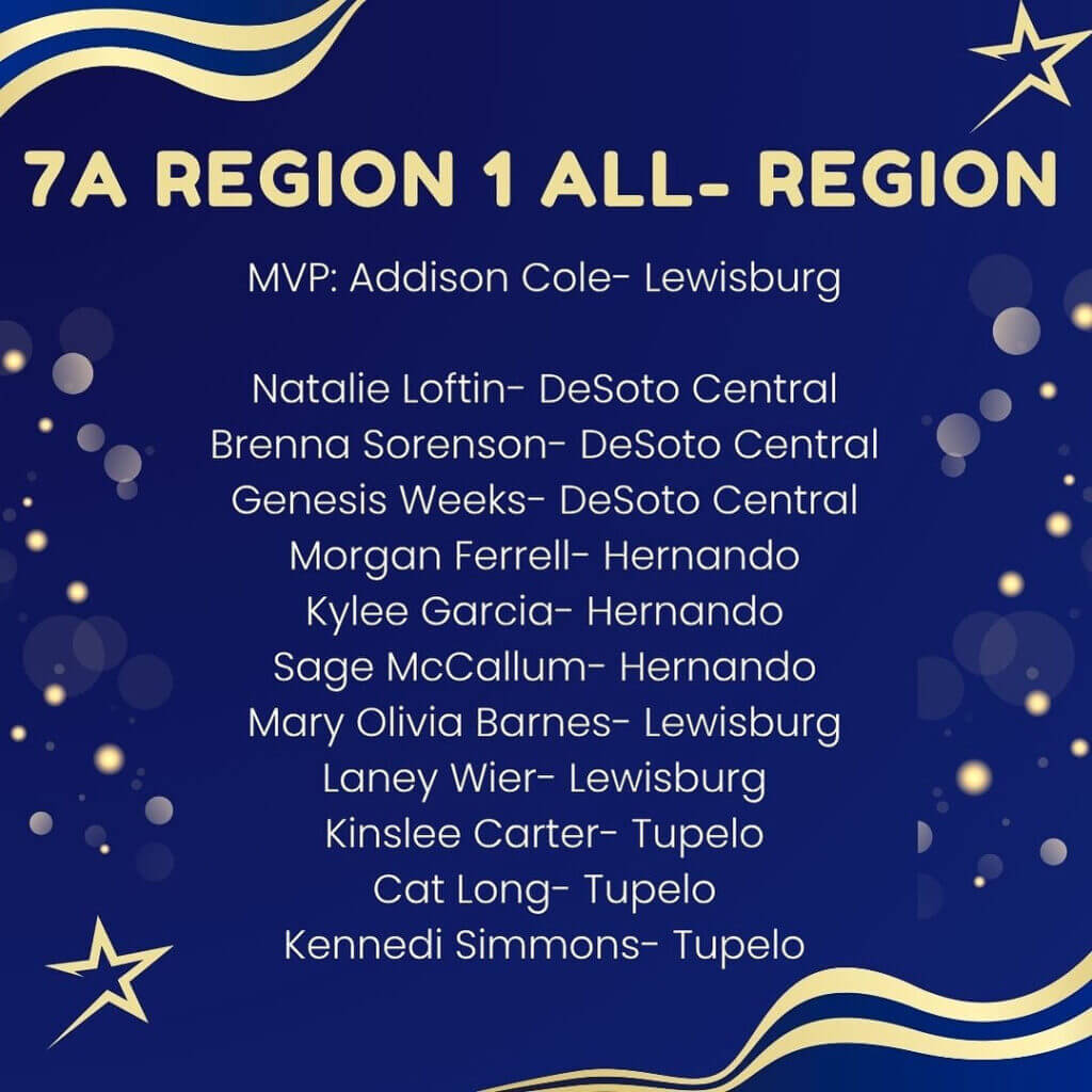 Volleyball coaches in Region 1-7A and Region 1-6A announced their all-region teams. In Region 1-7A, Lewisburg’s Addison Cole was named regional MVP, while Lake Cormorant’s Sofia Gonzalez is the MVP in Region 1-6A. Both were selected earlier at Miss Volleyball in their respective classes.
