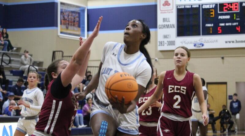 Photo: Nailah Herrera of Northpoint Christian goes up and under her ECS defender for two of her game-high 20 points in Monday’s contest. (Bob Bakken/desotocountynews.com)
