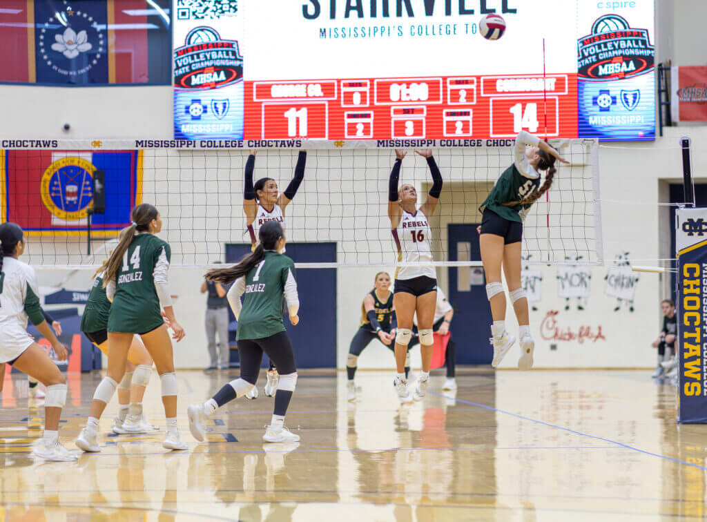 Photo: Payton Davis (51) of Lake Cormorant readies to slam a kill against a pair of George County Rebels Friday during the Lady Gators’s MHSAA 6A state championship. (Mary Scott/Oak River Media)