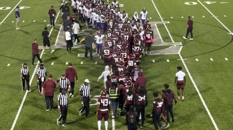 Photo: The handshake line between teams following the Horn Lake 35-20 victory over DeSoto Central Friday night. (Bob Bakken/desotocountynews.com)
