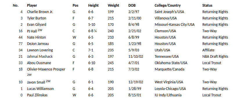 The 2025-26 roster includes three two-way players: PJ Hall, Olivier-Maxence Prosper and Javon Small.