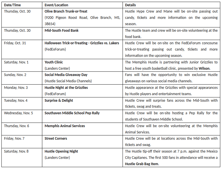 The Memphis Hustle will celebrate 10 Days Till Tip-Off of the 2025-26 season with various events across the Mid-South. The celebration will begin with the Olive Branch Trunk-or-Treat on Thursday, Oct. 30, and culminate with Opening Night vs. the Mexico City Capitanes on Saturday, Nov. 8, at 7 p.m. at Landers Center.