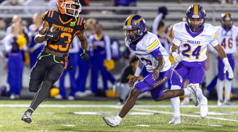 Photo: Southaven’s Glen Mason Jr. is chased down by a pair of DeSoto Central Jaguars in the jags’ 28-21 victory Friday night. (Credit Mary Scott/Oak River Media)