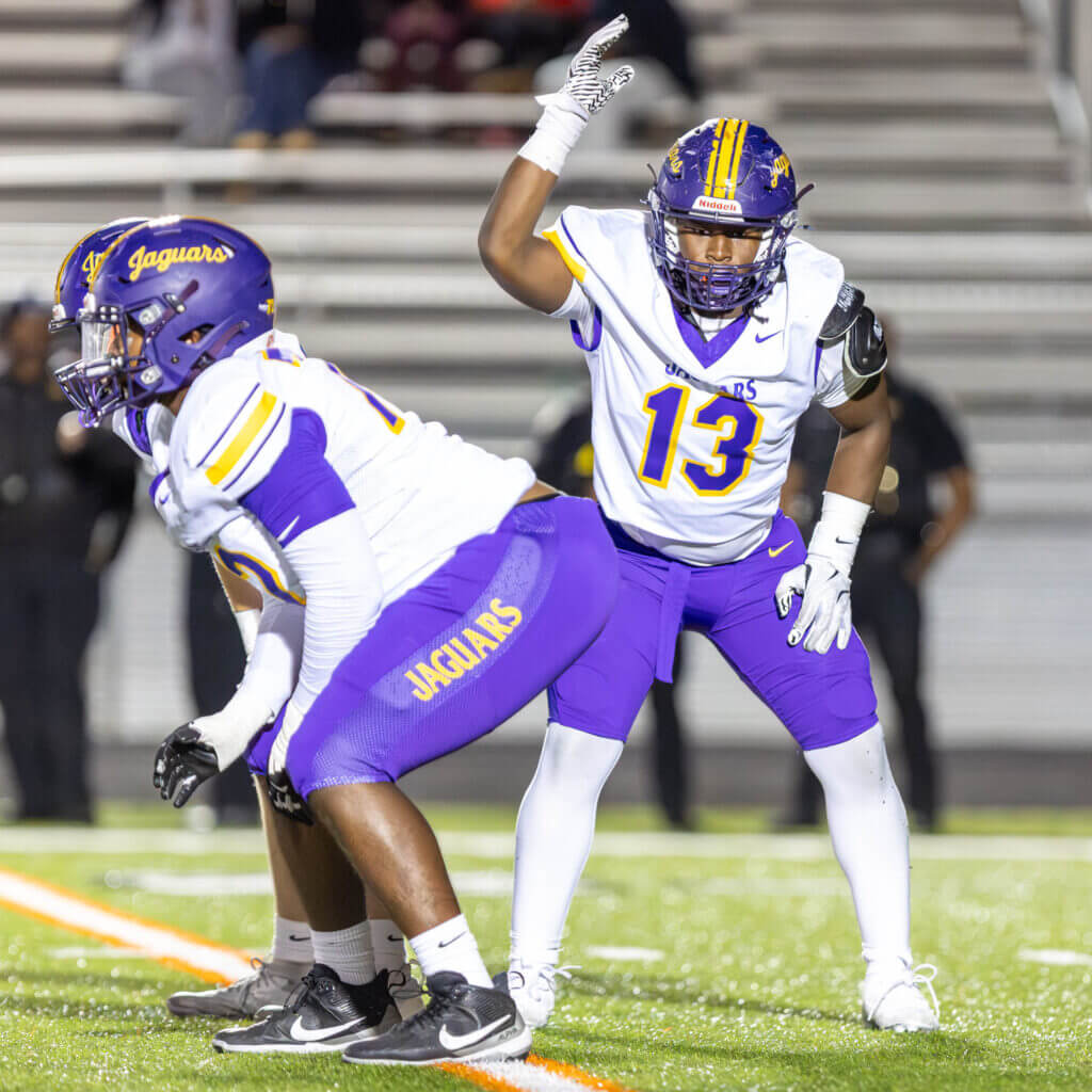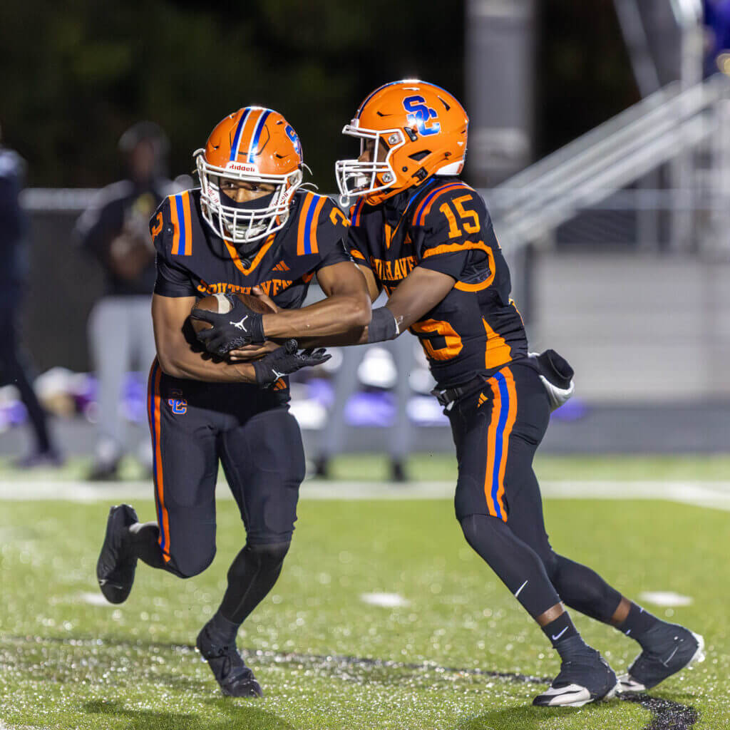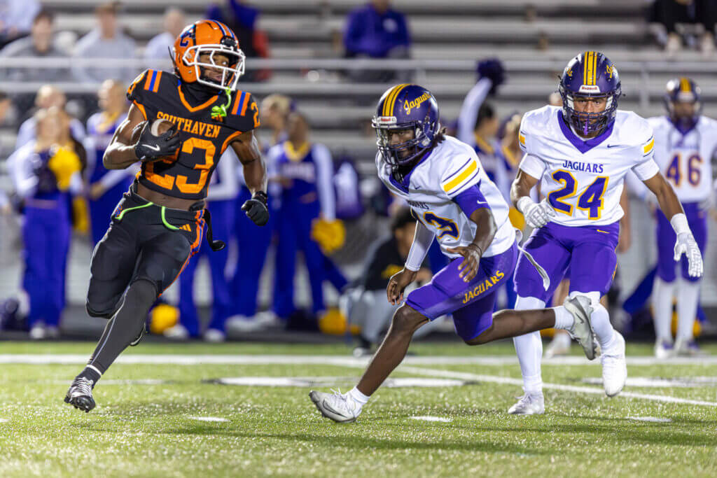 Photo: Southaven’s Glen Mason Jr. is chased down by a pair of DeSoto Central Jaguars in the jags’ 28-21 victory Friday night. (Credit Mary Scott/Oak River Media)