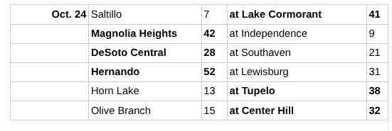 NOTABLES: Friday’s victory for DeSoto Central returned the Odis McCord Trophy back to Central Parkway. The annual game between the two schools in Southaven was named for the late athletic director at Southaven High School…Hernando’s Cooper Lankford ran for 113 yards and three touchdowns in the Tigers’ victory at Lewisburg. Patriot quarterback Kaysen Wiggins threw for 327 yards and a score, completing 18 of 31 passes with one interception…Tylen Matthews scored three rushing touchdowns in the Lake Cormorant 41-7 victory over Saltillo.