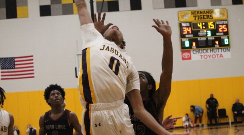 Photo: DeSoto Central’s Blake Price (0) reaches high for a rebound in Wednesday’s game against Horn Lake. (Bob Bakken/desotocountynews.com)