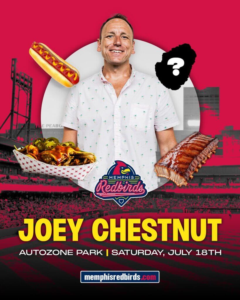MEMPHIS, Tenn. — The Memphis Redbirds announced Wednesday that world-renowned competitive eating champion Joey “Jaws” Chestnut will headline a special night of entertainment at AutoZone Park on Saturday, July 18, 2026.