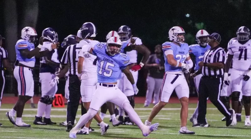 Photo: Rase Jones celebrates a tackle in the Rangers 33-13 win over Southwest on Thursday night. (Maylee Wiillhite/nwccrangers.com)