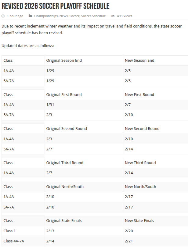 The Mississippi High School Activities Association has announced that the soccer postseason schedule is being pushed back a week due to the winter storm.