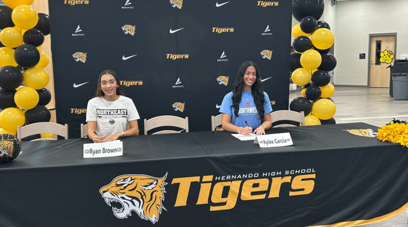 Photo: Hernando volleyball players Ryan Brown (NEMCC) and Kylee Garcia (NWCC) signed scholarships Thursday at the school. (Credit: @_duanecase on X/Twitter)