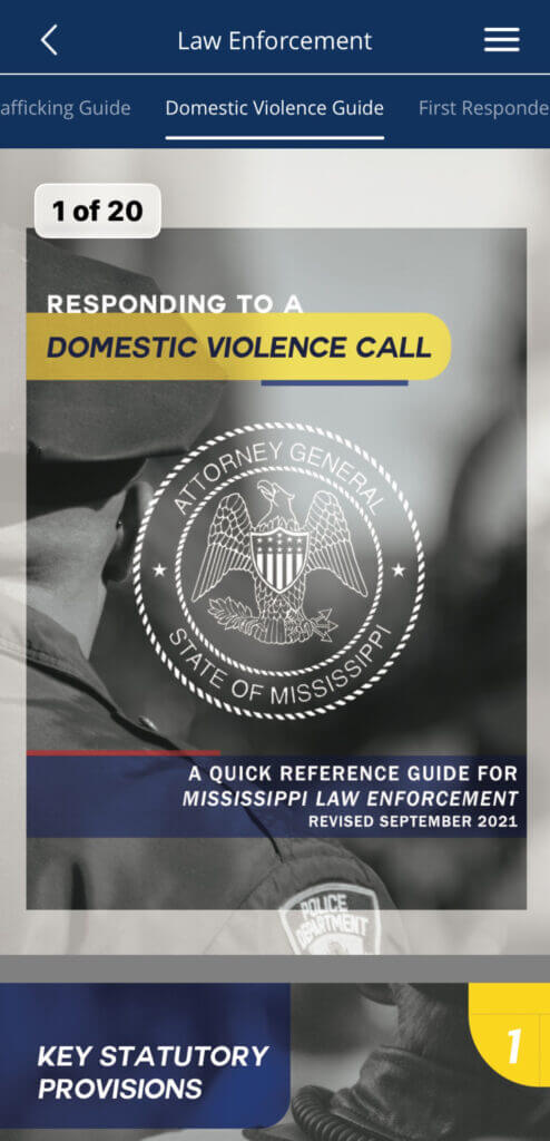 Mississippi’s law enforcement community also receives a specialized tab featuring upcoming AGO trainings, domestic violence and human trafficking reference guides, and access to the Domestic Violence and Protection Order Registries.