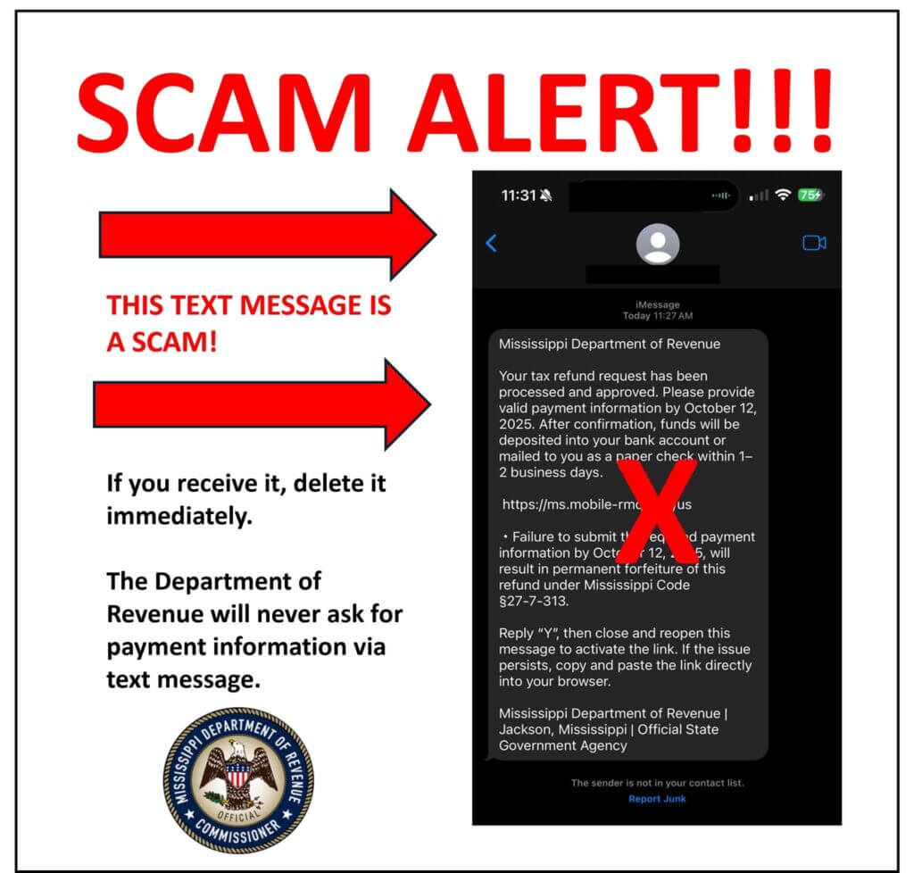 The department announced it has received reports of fraudulent texts being sent to Mississippians that appear to be from the Department of Revenue or the Department of Motor Vehicles. According to a news release, the messages may state that a tax refund has been approved and ask for payment information, or include false warnings about unpaid traffic violations, outstanding toll charges, or other fines owed.