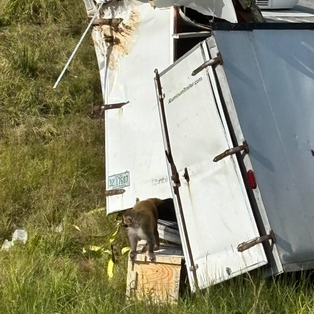 Heidelberg, Miss. (Jasper County Sheriff’s Dept.) — Authorities are urging caution after a truck transporting monkeys to a testing facility in Florida overturned near the 117-mile marker north of Heidelberg, releasing several animals into the area.