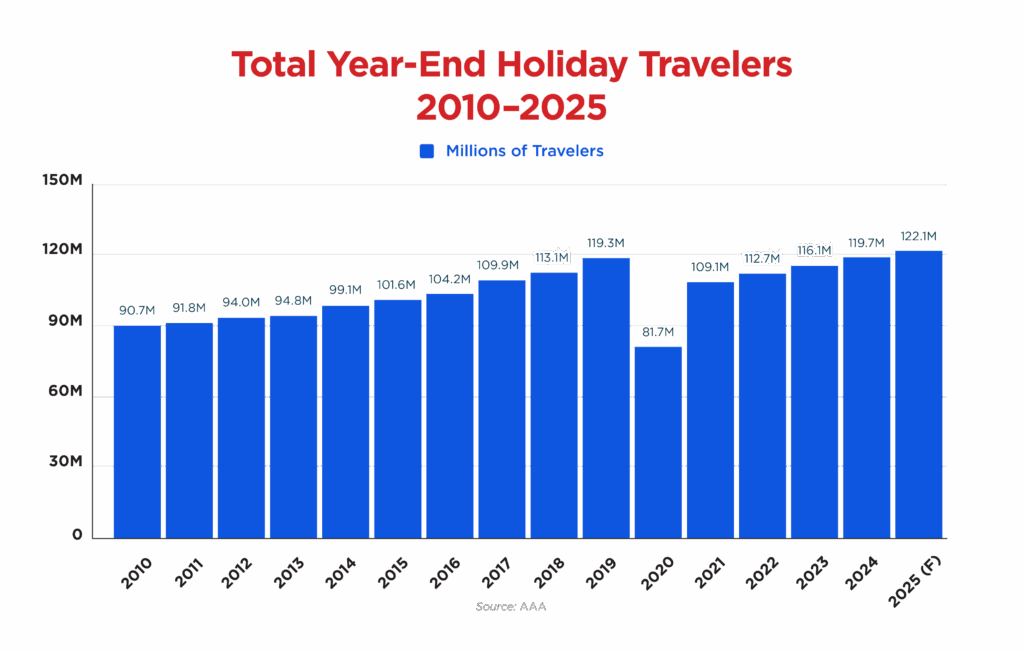 The 13-day year-end holiday period, which runs from Dec. 20 through Jan. 1, 2026, marks a 2.2 percent increase over last year’s record of 119.7 million travelers. The surge is driven by a mix of lower gas prices and a persistent post-pandemic demand for cruises and air travel.