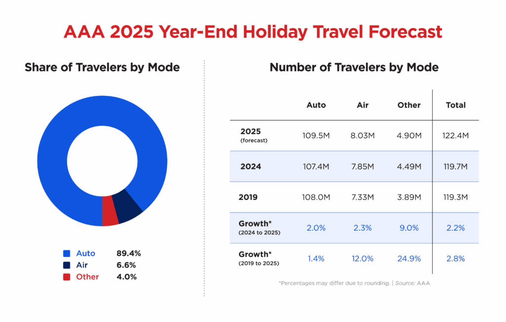 “Year-end travel is a mix of family road trips, friend getaways, and tropical vacations,” said Stacey Barber, Vice President of AAA Travel. “Holiday celebrations look different for everyone, but a common thread is the desire to travel, whether it’s returning to your hometown or exploring new destinations.”
