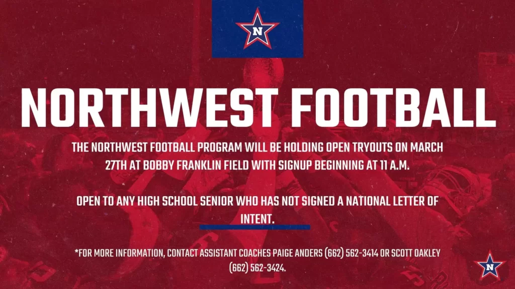 SENATOBIA – Northwest head football coach Benji Parker has announced an open tryout for the 2026 season roster for Friday, March 27 at 12:30 p.m.